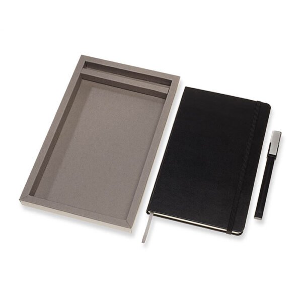 Considering including Moleskine Classic Notebook and Rollerball Pen Black in the corporate gift hamper for your customers and employees. The set is a combination of a notebook along with an innovative and elegant rectangular pen. Moleskine Classic Notebook and Rollerball Pen Black is a 130 x 210 mm large sized notebook with 240 pages. The paper used is of high quality 70 gsm ruled ivory paper. It is placed in a ABS matte black casing with a patented clip to fix the pen to the cover of the notebook. It also has an attractive bookmark and elastic closure to keep the papers secure. The rollerball pen is refillable and the whole set is packed in an attractive box which can be customised with the logo.